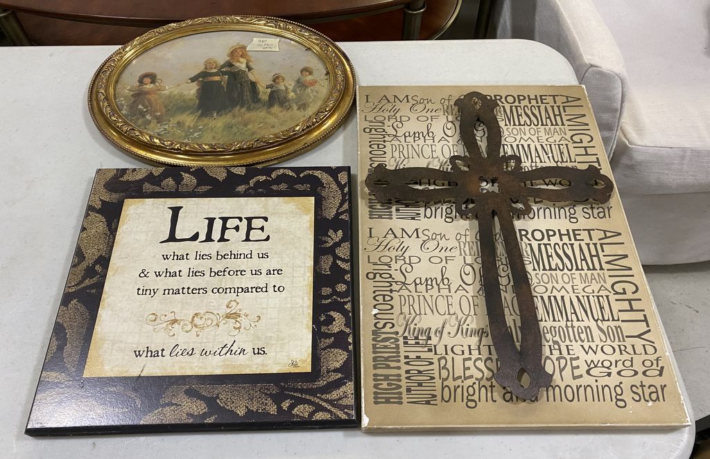 Cross wall plaque, Life quote, and Oval gold gilt print of Family. Location Left Metal Shelves Cross wall plaque, Life quote, and Oval gold gilt print of Family. Location Left Metal Shelves