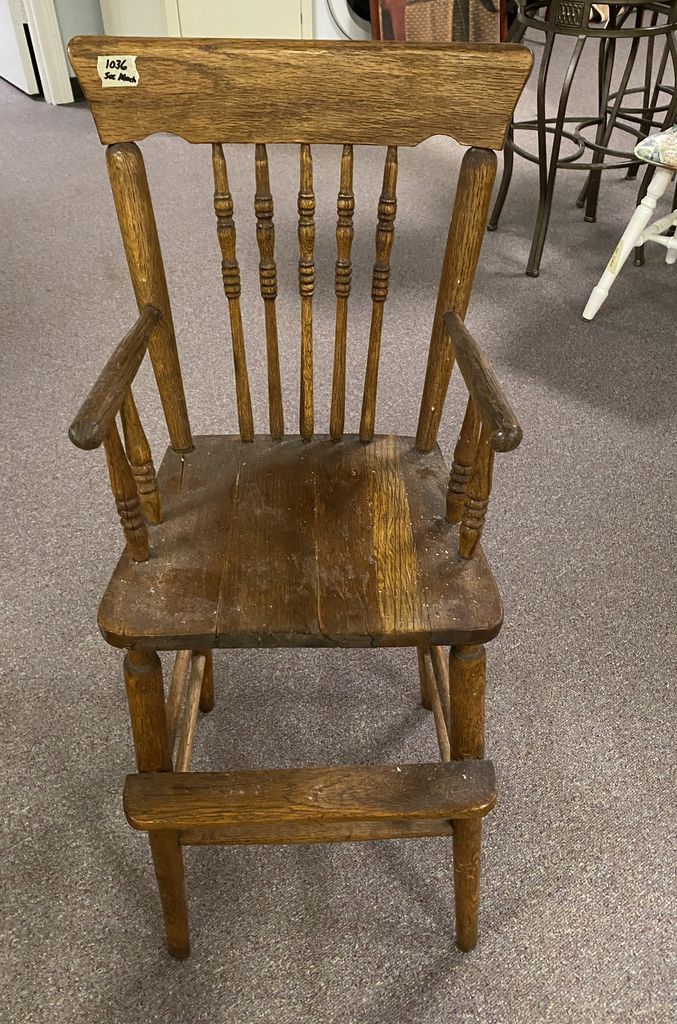 Old Oak Baby High Chair, Spindle back. Location: 5th Row Old Oak Baby High Chair, Spindle back. Location: 5th Row