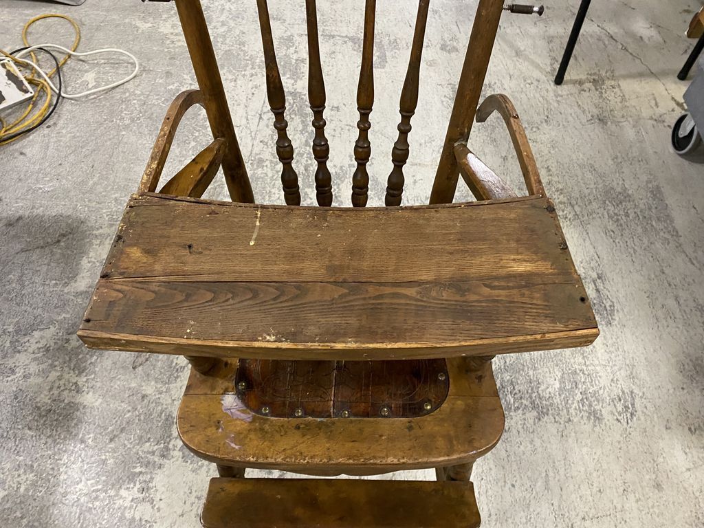 Vintage Pressed Back Oak High Chair, has tray, age wear. Location: 5th Row Vintage Pressed Back Oak High Chair, has tray, age wear. Location: 5th Row