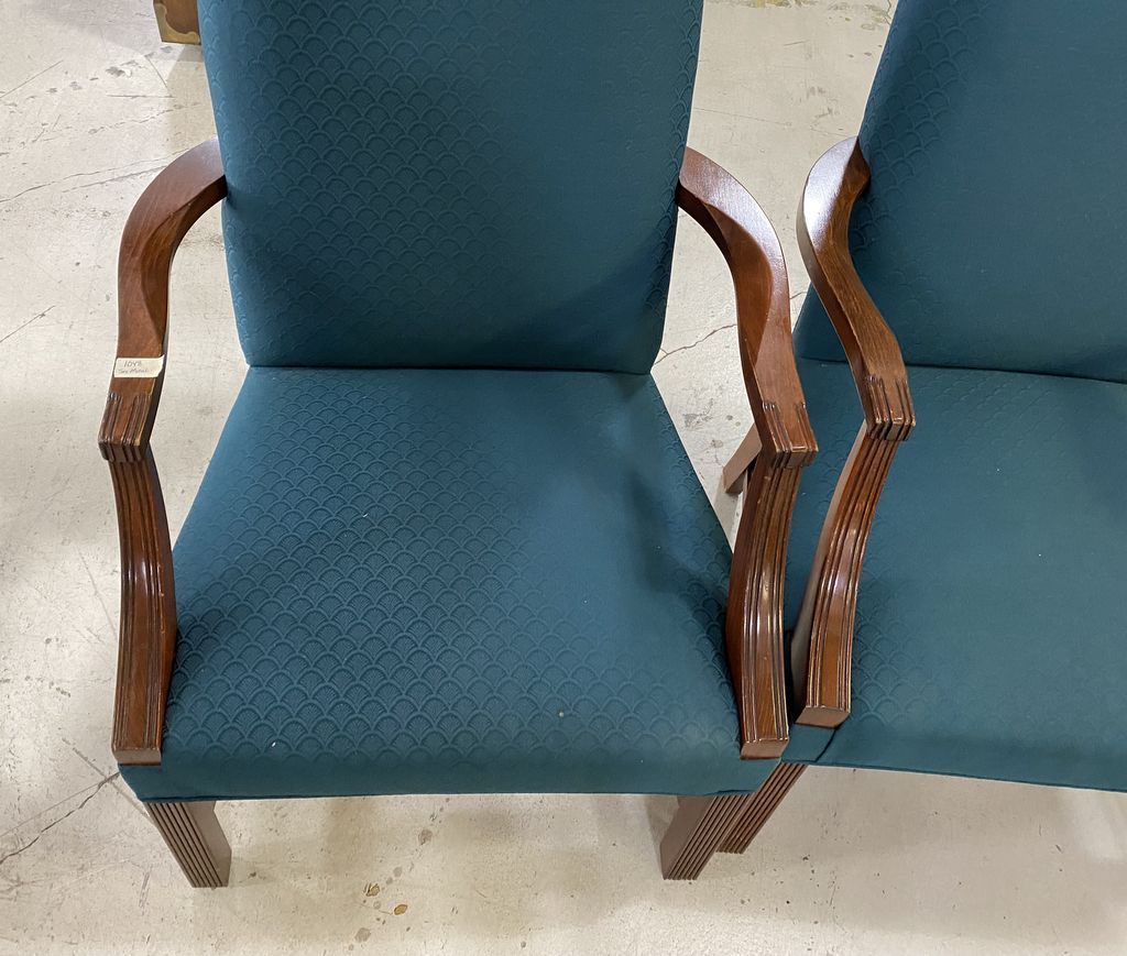 Pair of Arm Office Chairs, blue fabric. Location Left Office Pair of Arm Office Chairs, blue fabric. Location Left Office