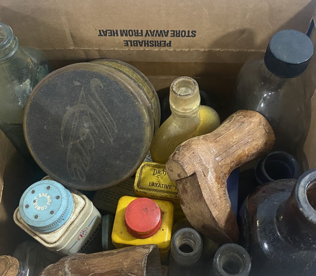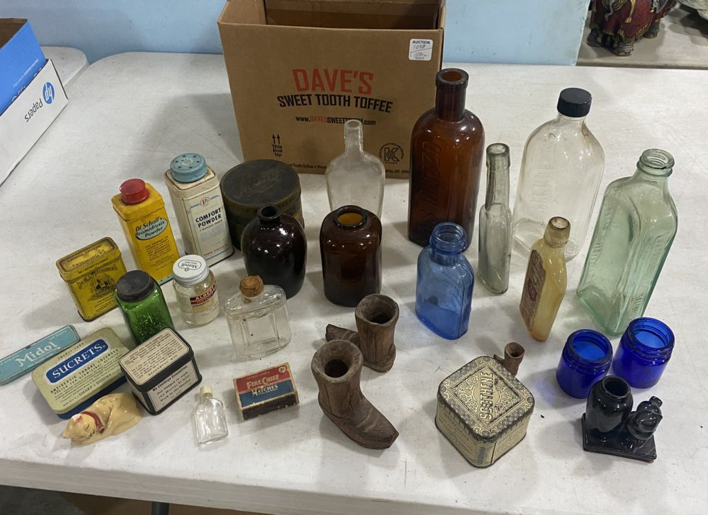 Box Of Assorted Tins And Bottles, Medicine bottles, snuff bottles. Location Left Metal Shelves Box Of Assorted Tins And Bottles, Medicine bottles, snuff bottles. Location Left Metal Shelves