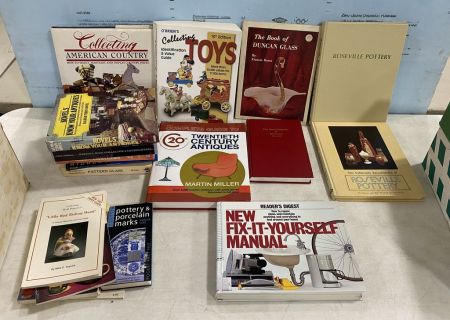American Country, Toys, Duncan Glass, Roseville Pottery, Antiques, Pattern Glass, Twentieth Century Antiques, Fix it Yourself Manual, pottery and porcelain. Location Right Metal Shelves American Country, Toys, Duncan Glass, Roseville Pottery, Antiques, Pattern Glass, Twentieth Century Antiques, Fix it Yourself Manual, pottery and porcelain. Location Right Metal Shelves