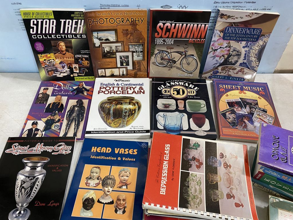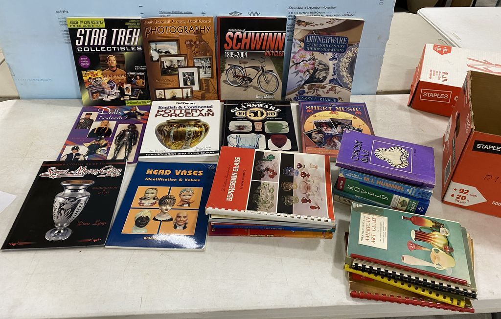 American Art Glass, Toy Airplanes, Collectible Cats, Cookbooks, Matchbox toys, Antiques Gudie, Head Vases, Mercury Glass, Pottery, Schwinn, Dinnerware, and more. Location Right Metal Shelves American Art Glass, Toy Airplanes, Collectible Cats, Cookbooks, Matchbox toys, Antiques Gudie, Head Vases, Mercury Glass, Pottery, Schwinn, Dinnerware, and more. Location Right Metal Shelves