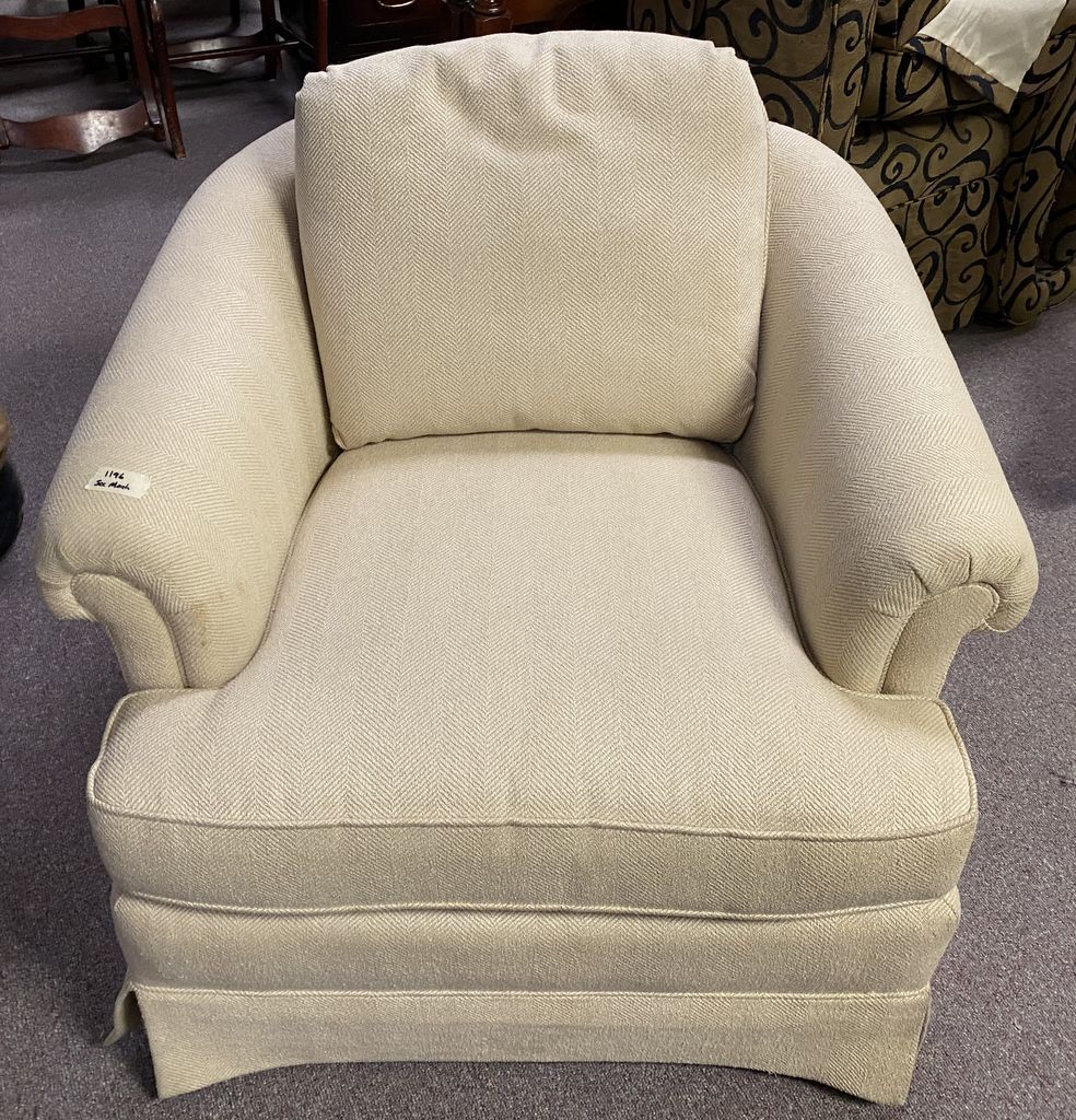 White Upholstery Swivel Arm Chair, clean condition. Location: 1st Row White Upholstery Swivel Arm Chair, clean condition. Location: 1st Row