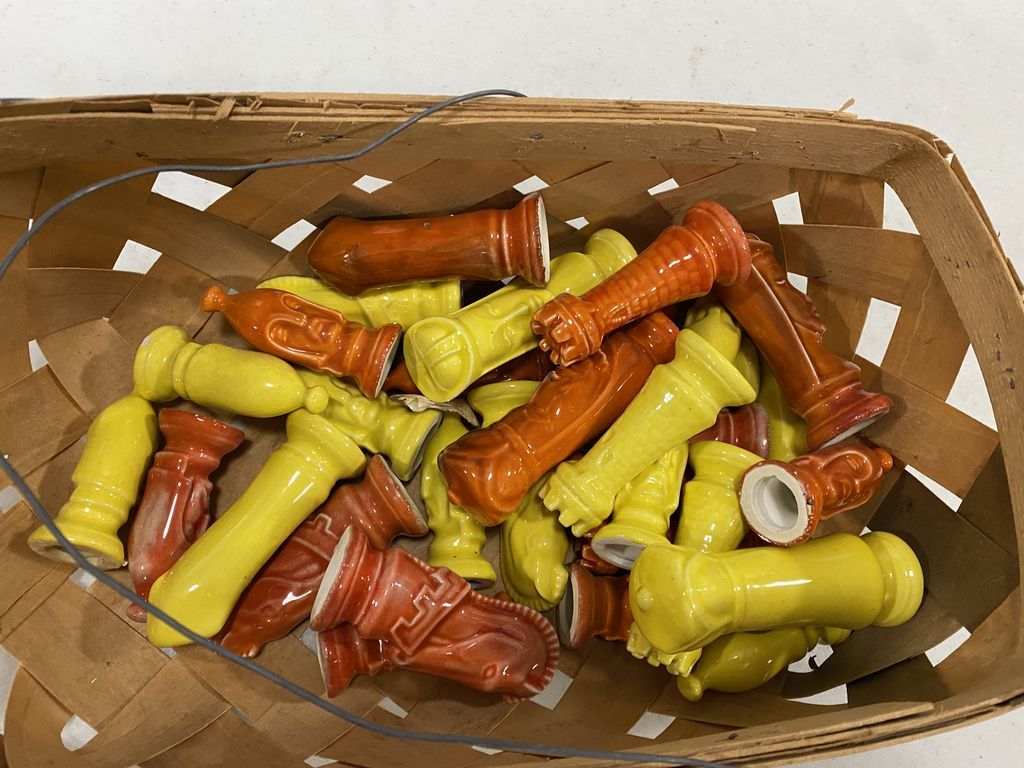 Painted Porcelain Chess Pieces, missing several, Location Left Metal Shelves Painted Porcelain Chess Pieces, missing several, Location Left Metal Shelves
