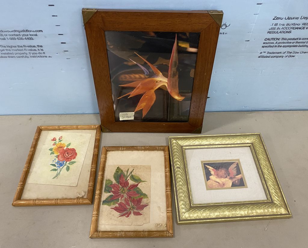 Two Flower prints, Cherub print, lily photograph, small prints, 10"h. 12"w, Location Left Metal Shelves Two Flower prints, Cherub print, lily photograph, small prints, 10"h. 12"w, Location Left Metal Shelves