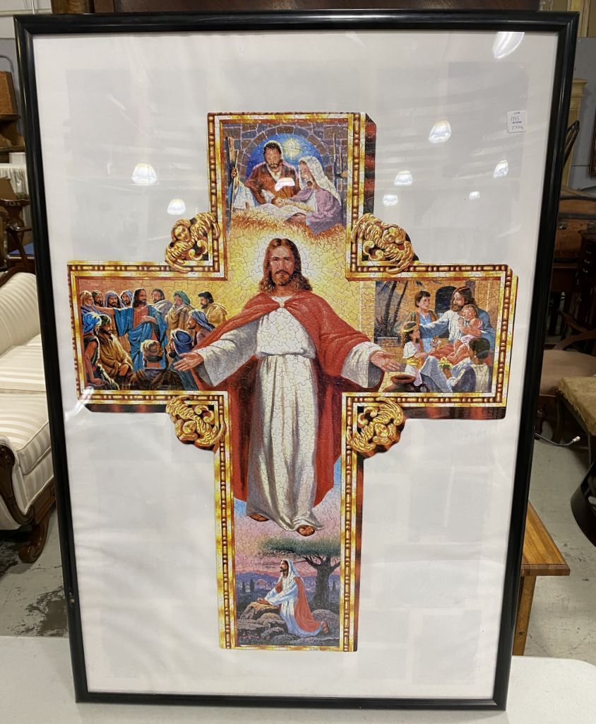 Framed Puzzle of Jesus on The Cross, framed, 41"h., 28"w. Location Art Back Wall Framed Puzzle of Jesus on The Cross, framed, 41"h., 28"w. Location Art Back Wall