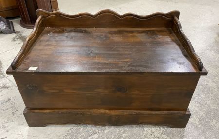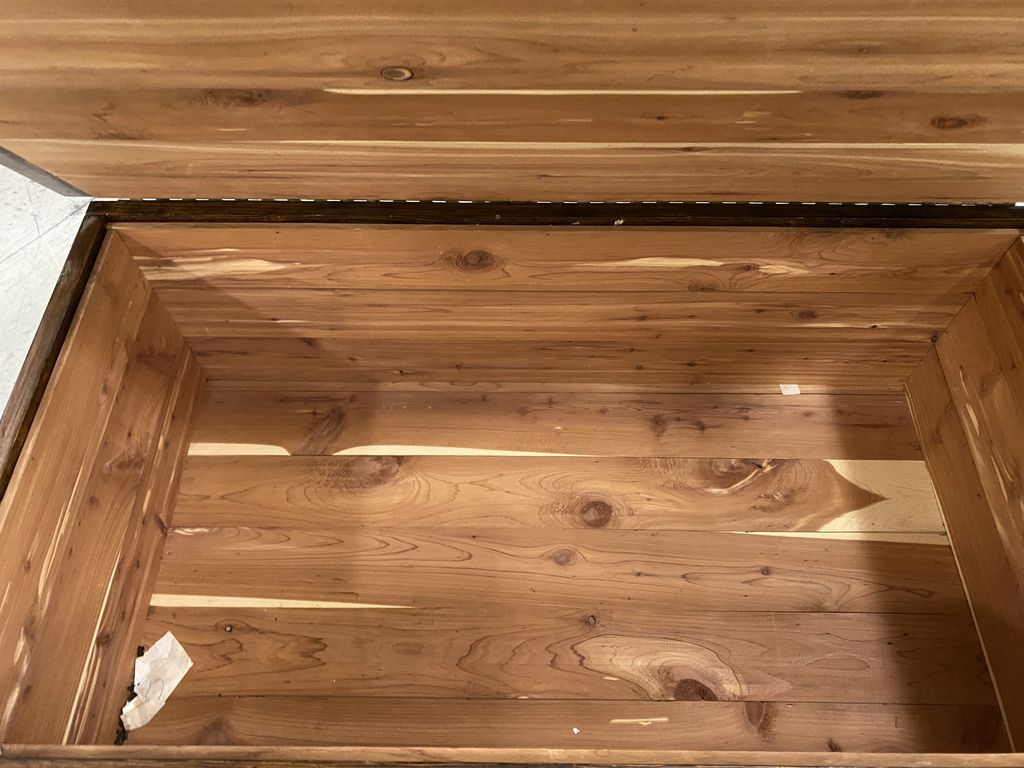 Pine exterior with cedar interior storage chest, has scratches and wear, 21"h., 36"w. Location: 2nd Row Pine exterior with cedar interior storage chest, has scratches and wear, 21"h., 36"w. Location: 2nd Row