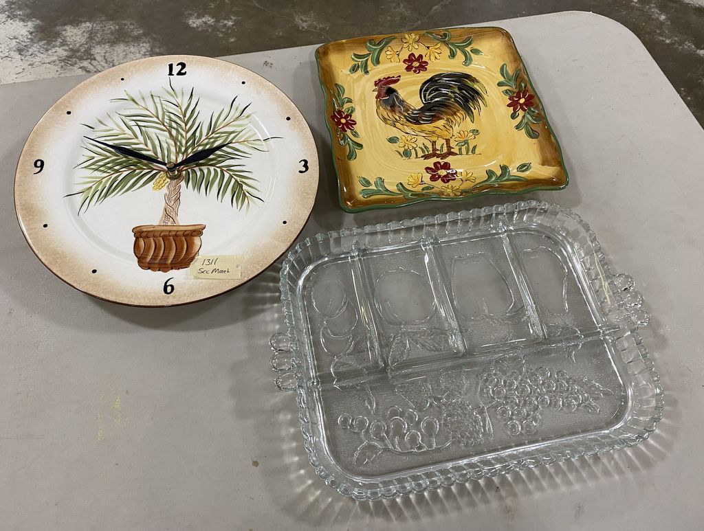 1311 Ceramic Tropical Clock, Rooster Plate, and Glass Relish Dish