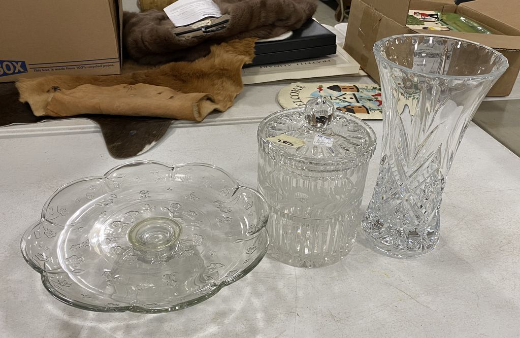 Pressed Glass Cake Stand, Crystal Candy Jar, and Crystal Vase, Location Left Metal Shelves Pressed Glass Cake Stand, Crystal Candy Jar, and Crystal Vase, Location Left Metal Shelves