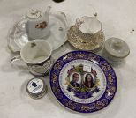 Collection of Porcelain Pieces, cup, saucer, pitcher, collector plate, and stoneware jar. Location Left Metal Shelves Collection of Porcelain Pieces, cup, saucer, pitcher, collector plate, and stoneware jar. Location Left Metal Shelves
