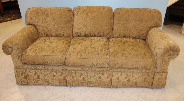 Three Cushion Damask/ Velvet Sofa 81" w., 35" dia., 35" h. Three Cushion Damask/ Velvet Sofa 81" w., 35" dia., 35" h.