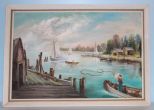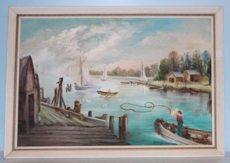 227 Oil on Board Scene of Sailboats, Cabins, Fisherman at the Dock, Signed Gridley