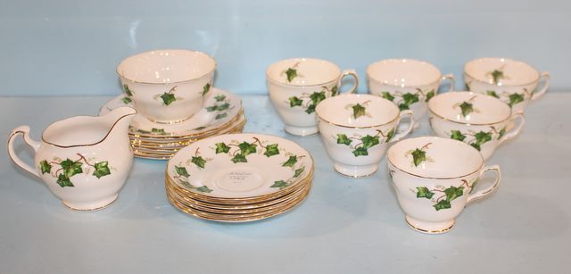Consisting of six cups/ saucers, six bread/ butter, creamer, sugar; 20 pieces total Consisting of six cups/ saucers, six bread/ butter, creamer, sugar; 20 pieces total