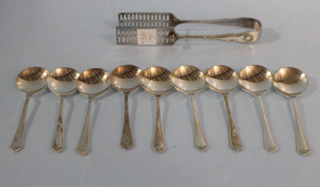 256 Plated Tongs, Set of Nine Plated Bouillon Spoons