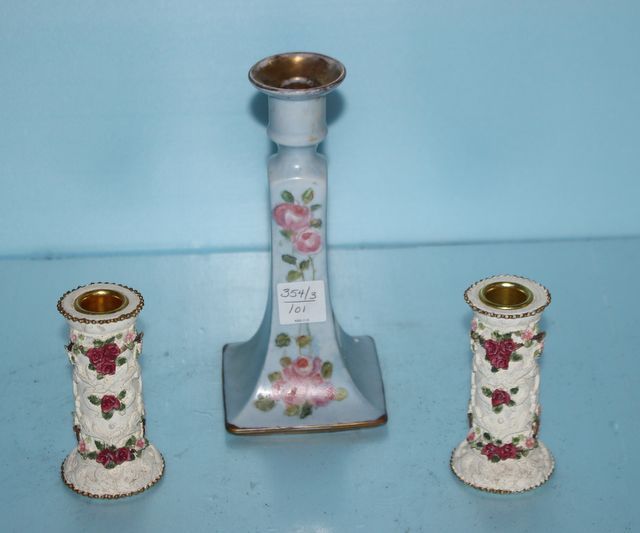 Pair of resign candlesticks with roses 4" h. ; hand painted candlestick 8" h. Pair of resign candlesticks with roses 4" h. ; hand painted candlestick 8" h.