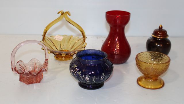 402 Amber Basket, Pink Basket, Blue Vase, Red Vase, Amber Dish, Brown Temple Jar