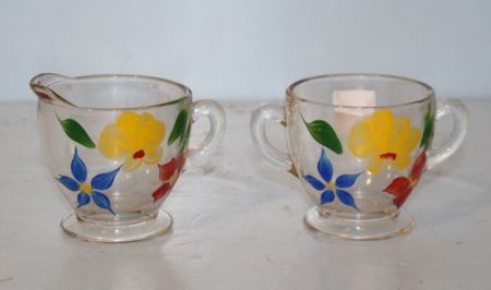 409 Clear Creamer and Sugar with Hand Painted Flowers