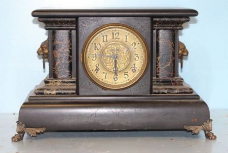 Painted black and faux grain mantel clock with brass lions head rings and paw feet; missing pendulum Painted black and faux grain mantel clock with brass lions head rings and paw feet; missing pendulum