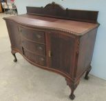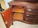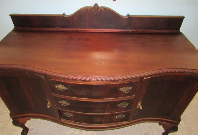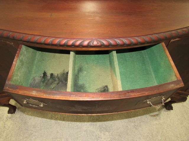 Three drawer, top flatware drawer with felt lining, two door storage, has wear, needs work, is dove tailed, has back splash, 45"h., 60"w., 21"d. Three drawer, top flatware drawer with felt lining, two door storage, has wear, needs work, is dove tailed, has back splash, 45"h., 60"w., 21"d.