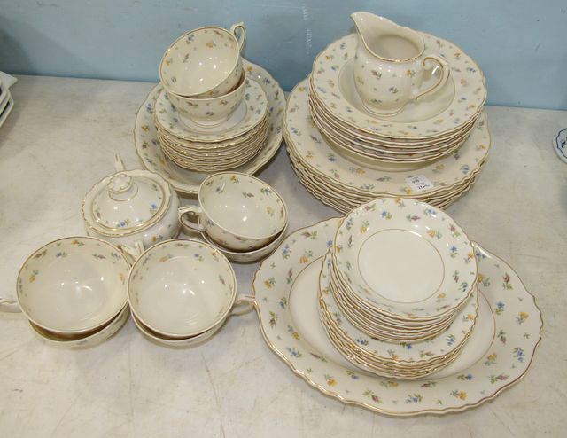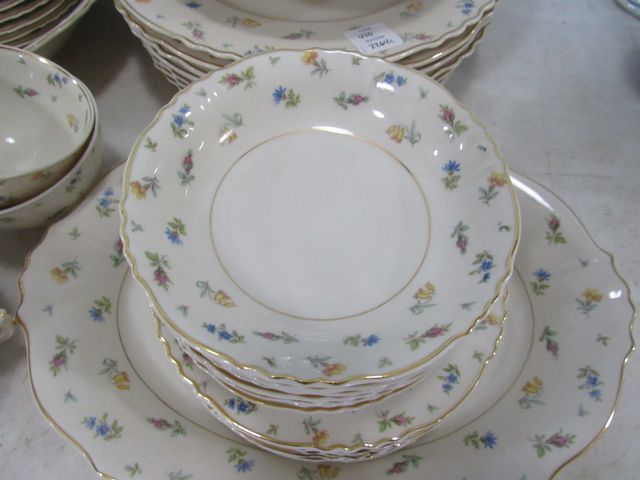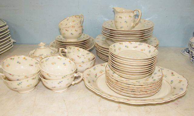 Made in America, seven dinner plates, seven dessert plates, six bowls, eight saucers, nine bowls, two platters, sugar, eight cups. Made in America, seven dinner plates, seven dessert plates, six bowls, eight saucers, nine bowls, two platters, sugar, eight cups.