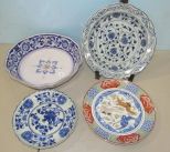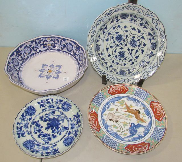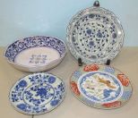 Italy ceramic blue and white center piece bowl 4"h., 14"dia., Imari charger 12"dia., Blue and white Chinese plate 14"dia., Blue and white plate 10"dia, include metal plate stand. Italy ceramic blue and white center piece bowl 4"h., 14"dia., Imari charger 12"dia., Blue and white Chinese plate 14"dia., Blue and white plate 10"dia, include metal plate stand.