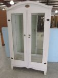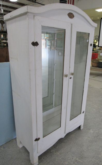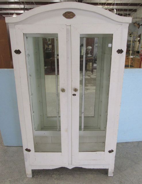 Painted white, mirror back, clear glass doors, has wear, 72"h., 40"w., 17"d. Painted white, mirror back, clear glass doors, has wear, 72"h., 40"w., 17"d.