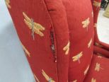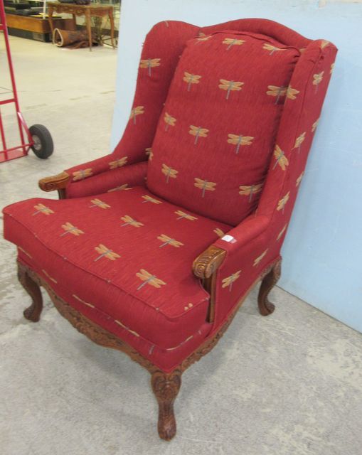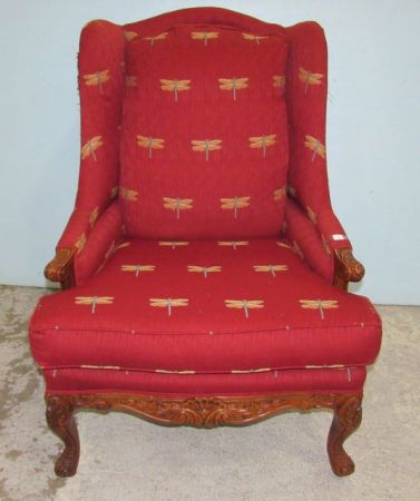 French style carved woo frame, butterfly fabric, red, has rip on side of seam, 44"h. French style carved woo frame, butterfly fabric, red, has rip on side of seam, 44"h.