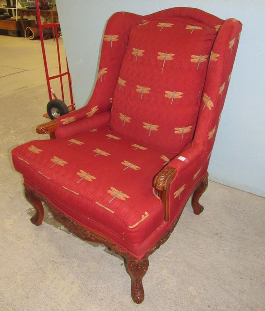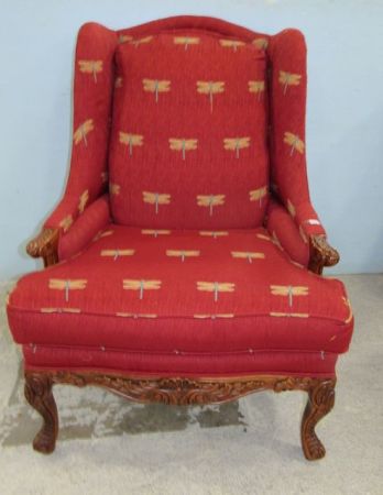 French style carved woo frame, butterfly fabric, red, 44"h. French style carved woo frame, butterfly fabric, red, 44"h.