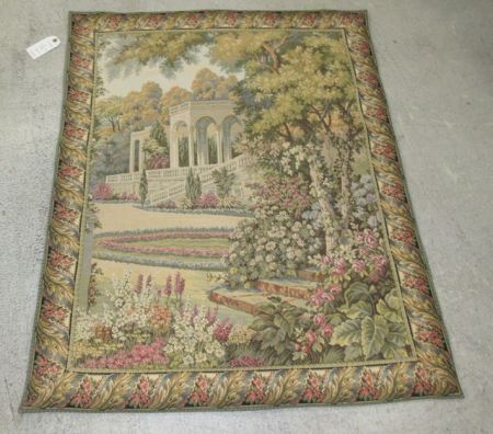 Floral and House scene tapestry, modern decor, missing hanging rod, 44"h., 36"w. Floral and House scene tapestry, modern decor, missing hanging rod, 44"h., 36"w.