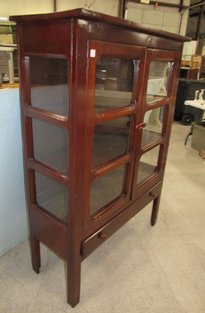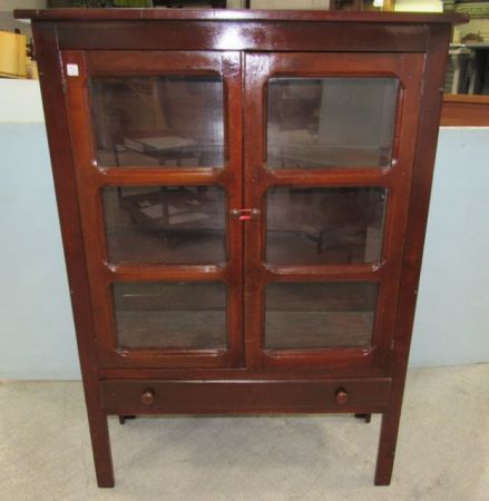 Two wood shelves, glass door and side panels, painted red, one drawer, 59"h., 42"w., 17"d. Two wood shelves, glass door and side panels, painted red, one drawer, 59"h., 42"w., 17"d.