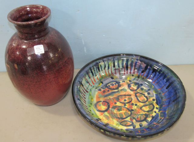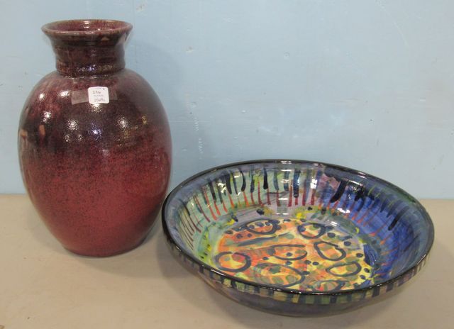 Mustard Seed bowl 4"h., 15"dia., Wine colored pottery vase by Emmett Collier 14"h. Mustard Seed bowl 4"h., 15"dia., Wine colored pottery vase by Emmett Collier 14"h.