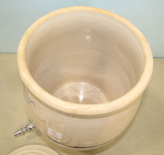 Blue label, crock in good condition, has lid, USA, 15"h. Blue label, crock in good condition, has lid, USA, 15"h.