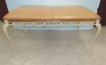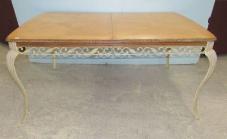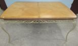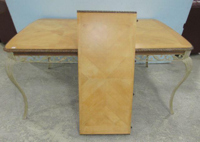 Metal vine design base, light wood top, has leaf, distressed base, without leaf, 29"h., 65"w. Metal vine design base, light wood top, has leaf, distressed base, without leaf, 29"h., 65"w.