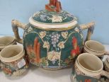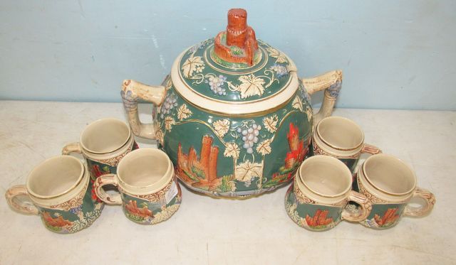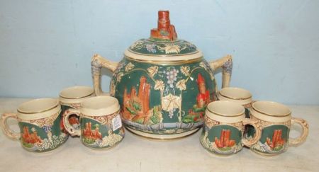 Grapevine trim with multiple castles in Germany, six mugs, ceramic, no ladle. Grapevine trim with multiple castles in Germany, six mugs, ceramic, no ladle.