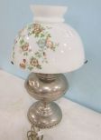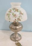 Has floral painted white glass globe, no hurricane glass piece, has some dents on frame, 18"h., Has floral painted white glass globe, no hurricane glass piece, has some dents on frame, 18"h.,