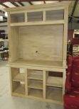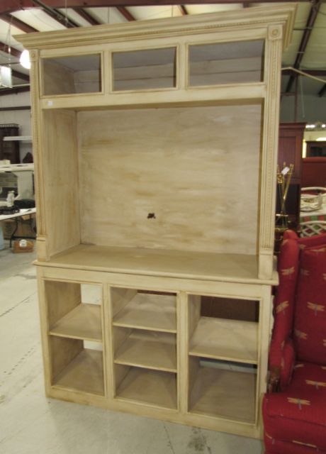 Painted, hand made wide enough for flat screen tv, two piece with bottom cubby hole storage, not to heavy, 89"h., 56"w., 20"d. Painted, hand made wide enough for flat screen tv, two piece with bottom cubby hole storage, not to heavy, 89"h., 56"w., 20"d.