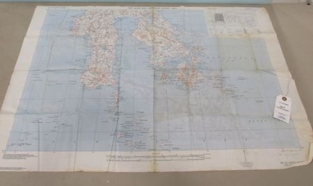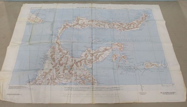 Southwest Pacific Area double sided silk map, No.23 North Celebes, No.24 SOuth Celebes,browned areas 36"w., 32"h. Southwest Pacific Area double sided silk map, No.23 North Celebes, No.24 SOuth Celebes,browned areas 36"w., 32"h.