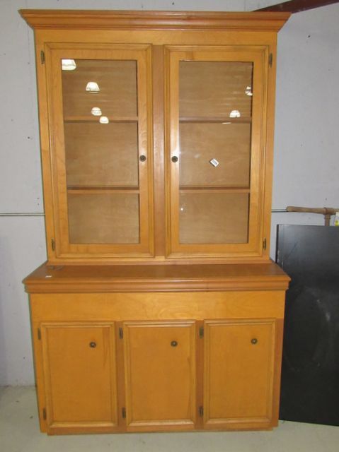 Glass in doors, three bottom storage doors, can be moved in two pieces, 84"h., 49"w. Glass in doors, three bottom storage doors, can be moved in two pieces, 84"h., 49"w.