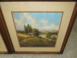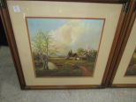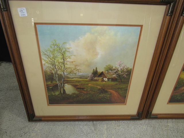 Wood framed, matted, prints of cabins and mountains, 23"h., 22"w. Wood framed, matted, prints of cabins and mountains, 23"h., 22"w.