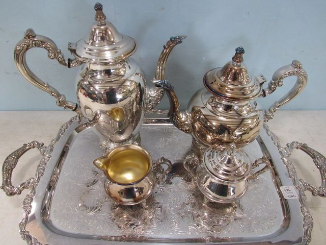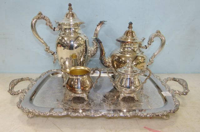 Footed handled serving tray 24"w., Water Pitcher 11"h., coffee pitcher 9"h., creamer, and sugar. Footed handled serving tray 24"w., Water Pitcher 11"h., coffee pitcher 9"h., creamer, and sugar.