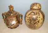 Gold painted, handled, made in china ginger jar 10"h. and covered jar 9"h. Gold painted, handled, made in china ginger jar 10"h. and covered jar 9"h.