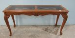 Two glass panels, bolt on legs, has some wear, 25"h., 52"w., 17"d. Two glass panels, bolt on legs, has some wear, 25"h., 52"w., 17"d.