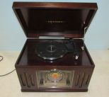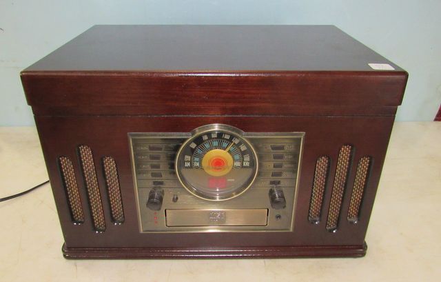 Modern, also has compact disc player, mahogany finish case, 11"h., 18"w., 12"d. Modern, also has compact disc player, mahogany finish case, 11"h., 18"w., 12"d.