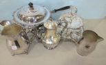 Silver plate warmer Webster Wilcox, "Baroque" by Wallace two tier serving dish, WM Rogers pitcher 7"h., "American Rose" by Webster Wilcox pitcher 8 1/2"h., National pitcher. Silver plate warmer Webster Wilcox, "Baroque" by Wallace two tier serving dish, WM Rogers pitcher 7"h., "American Rose" by Webster Wilcox pitcher 8 1/2"h., National pitcher.