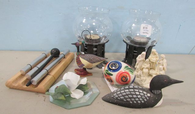 Pair of modern metal base glass candle holders, Gail Pittman egg, Boehm Society Rose 1991, instrument, hand carved duck, Mary in manger resin figurine. Pair of modern metal base glass candle holders, Gail Pittman egg, Boehm Society Rose 1991, instrument, hand carved duck, Mary in manger resin figurine.