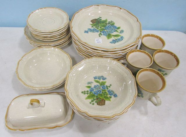 Four bowls, four mugs, butter dish, two soap bowls, six saucers, four salad plates, eight dinner plates. Four bowls, four mugs, butter dish, two soap bowls, six saucers, four salad plates, eight dinner plates.