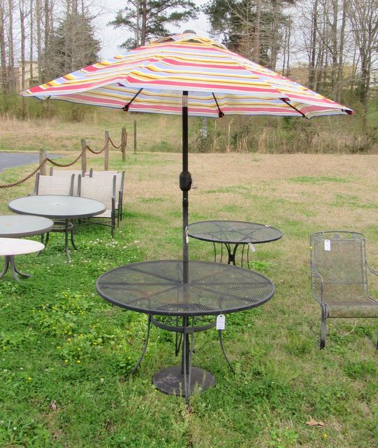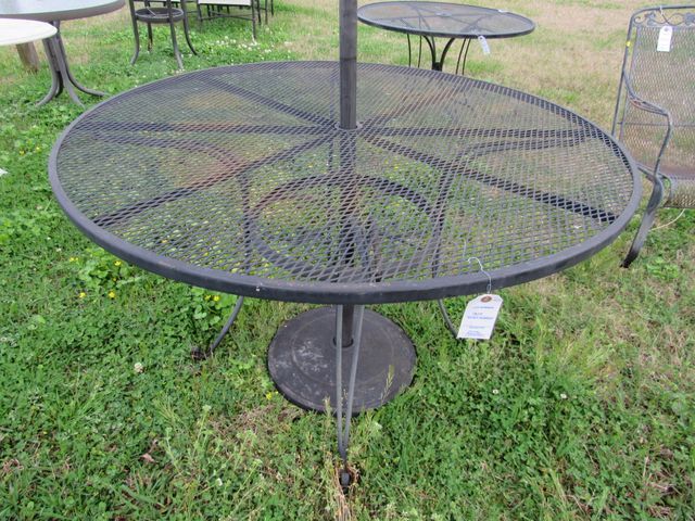 Round mesh top black iron table with umbrella kit. Round mesh top black iron table with umbrella kit.