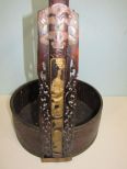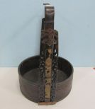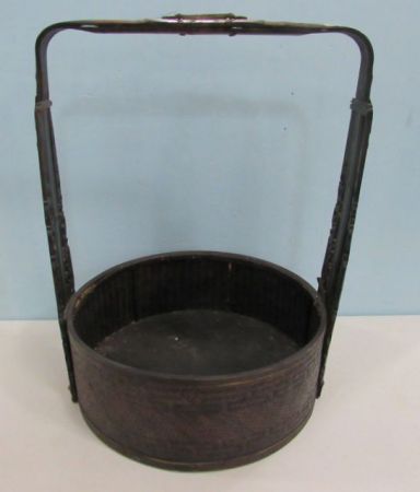 Woven basket, carved design handled, 26"h., 21"w. Woven basket, carved design handled, 26"h., 21"w.