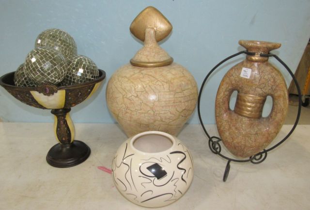 Modern terra cotta urn 20"h., terra cotta vase with metal stand 16"h., Resin ornate compote with glass mosaic balls 12"h., White pottery white vase. Modern terra cotta urn 20"h., terra cotta vase with metal stand 16"h., Resin ornate compote with glass mosaic balls 12"h., White pottery white vase.